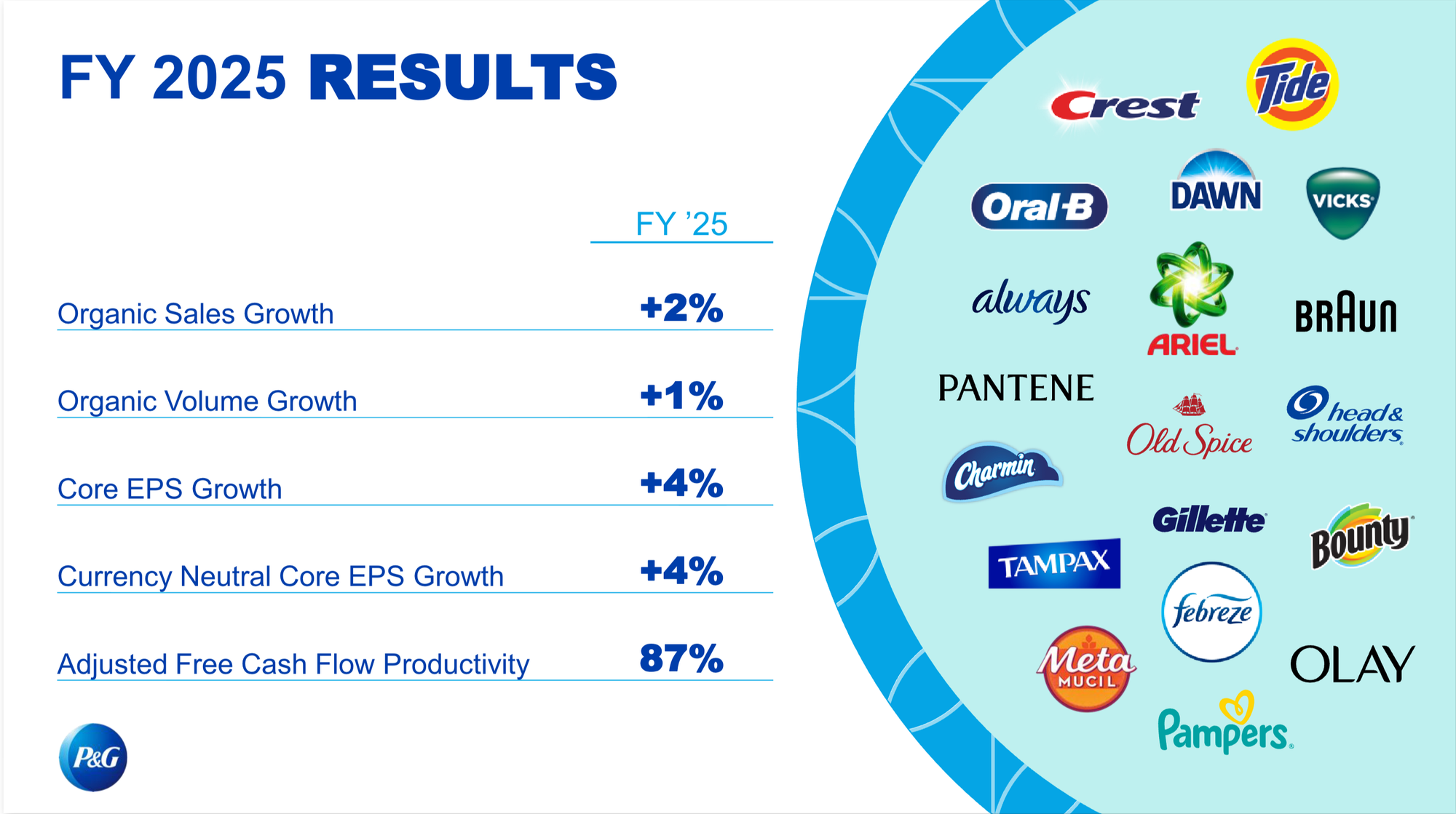 One of the most reliable consumer staples companies in the world, with brands like Tide, Gillette, Pampers, and Crest.