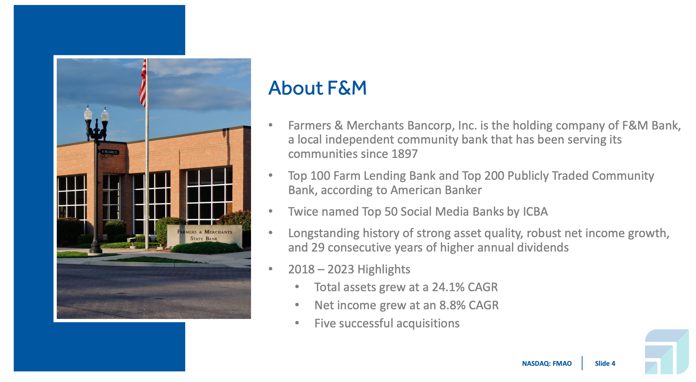 Farmers & Merchants Bancorp is a locally owned and operated community bank with 32 locations in California. Due to its small market cap and its low liquidity, it passes under the radar of most investors. Nevertheless, F&M Bank has paid uninterrupted dividends for 88 consecutive years and has raised its dividend for 58 consecutive years.
