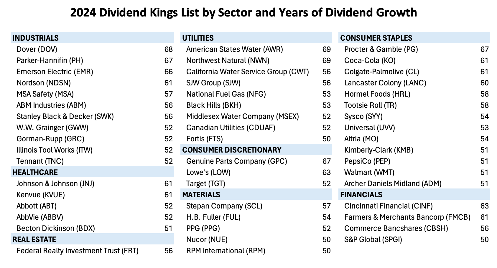 Dividend Kings are companies that have increased their dividends for at least 50 consecutive years.