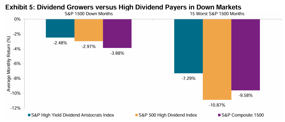 Dividend growers tend to fall less than the market during drawdowns and bear markets.