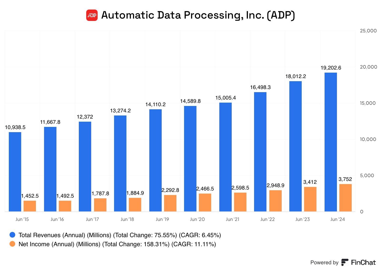 - ADP has very stable revenue and income growth