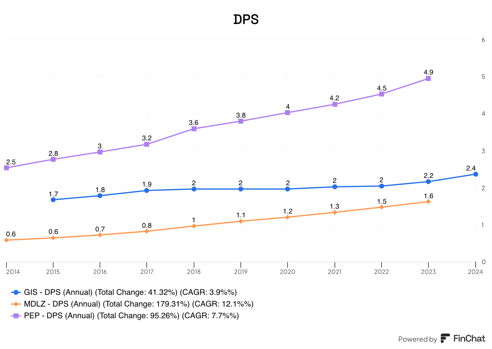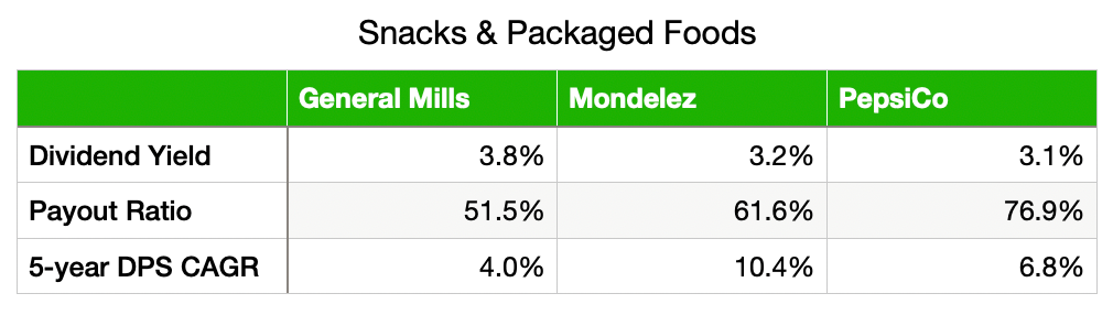 - Dividend growth is less consistent than Mondelez or PepsiCo