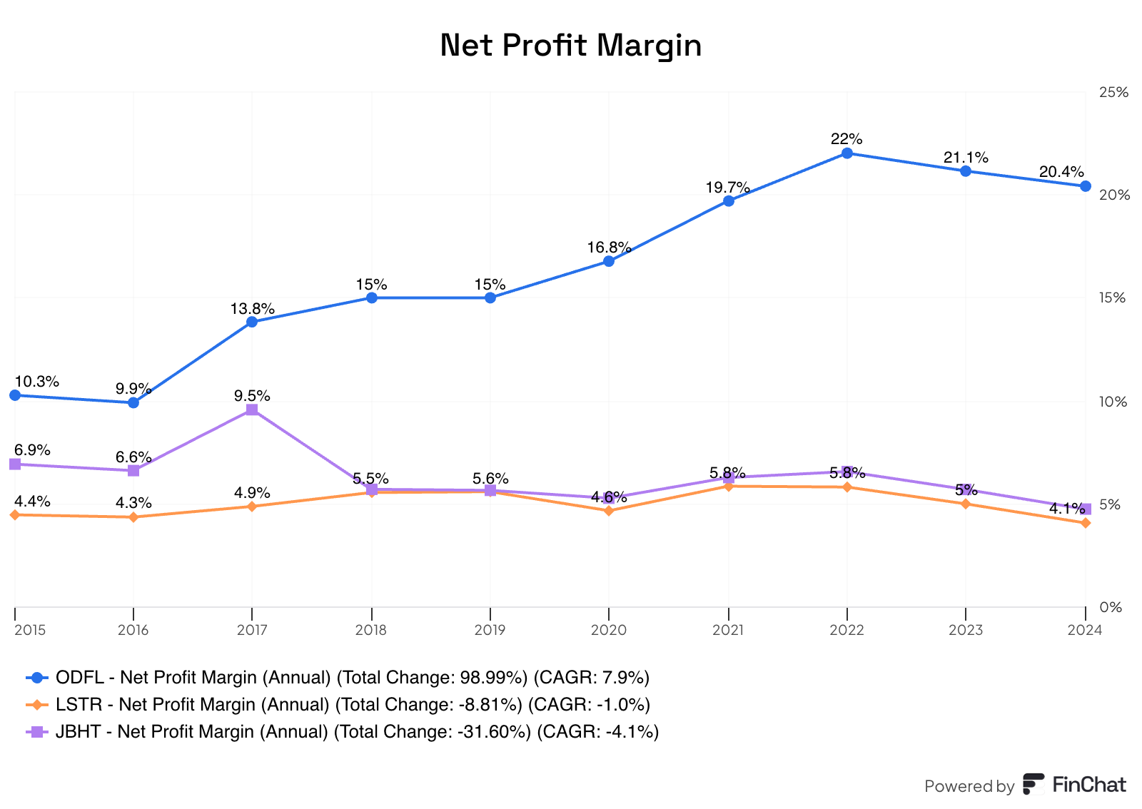 In 2024, Old Dominion’s profit margin was 20%. That’s insane for a trucking company. Most competitors struggle to get half that.