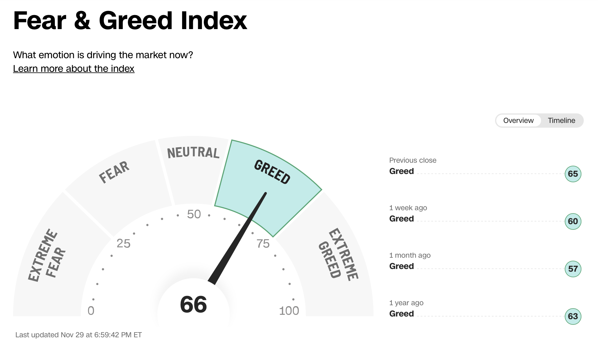 The Fear & Greed Index indicates that we are currently in ‘Greed’ Mode.