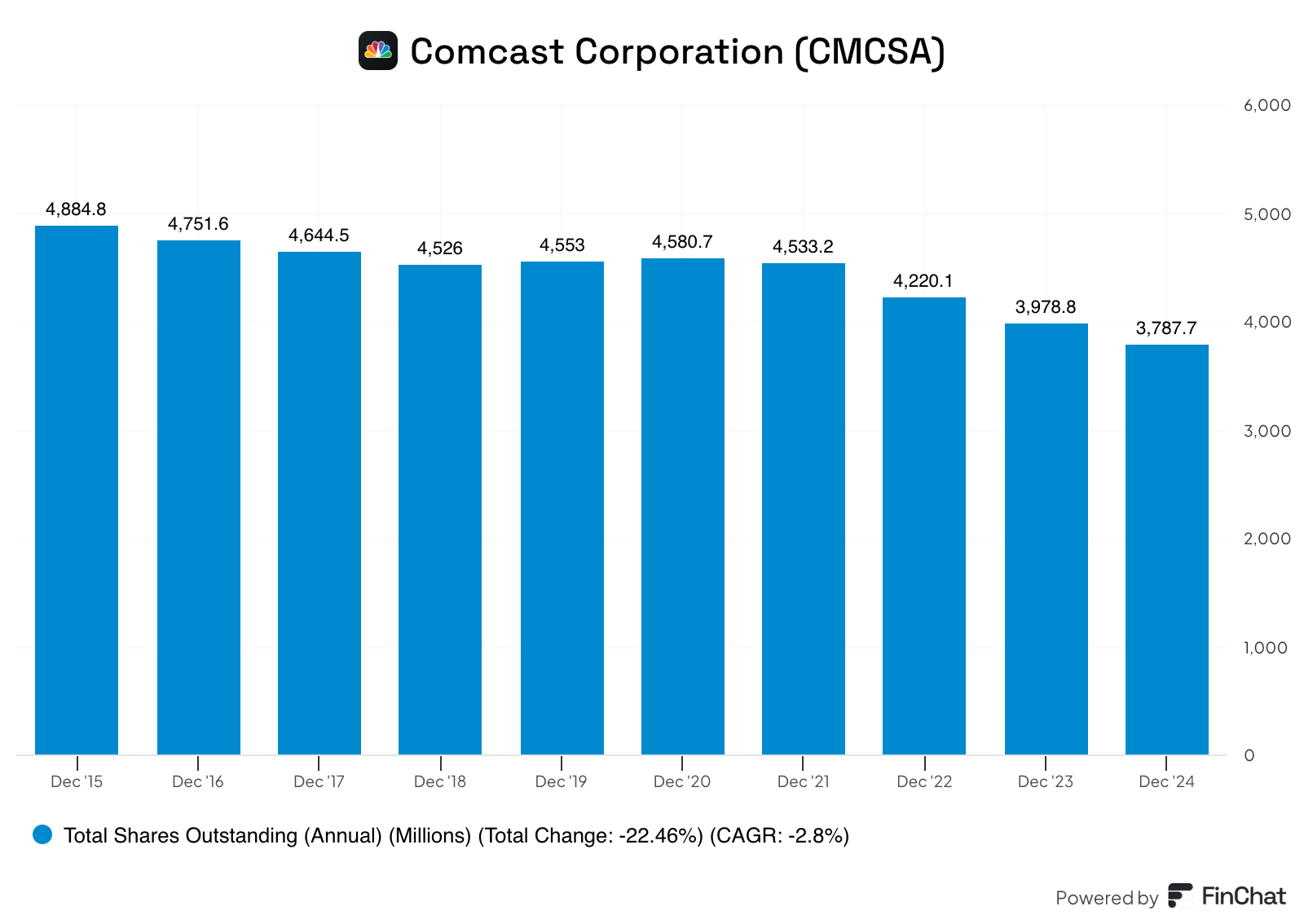 It owns NBCUniversal, the Xfinity brand, and the wildly profitable broadband business. The company has aggressively repurchased shares, cutting its count by over 30% in the last decade.