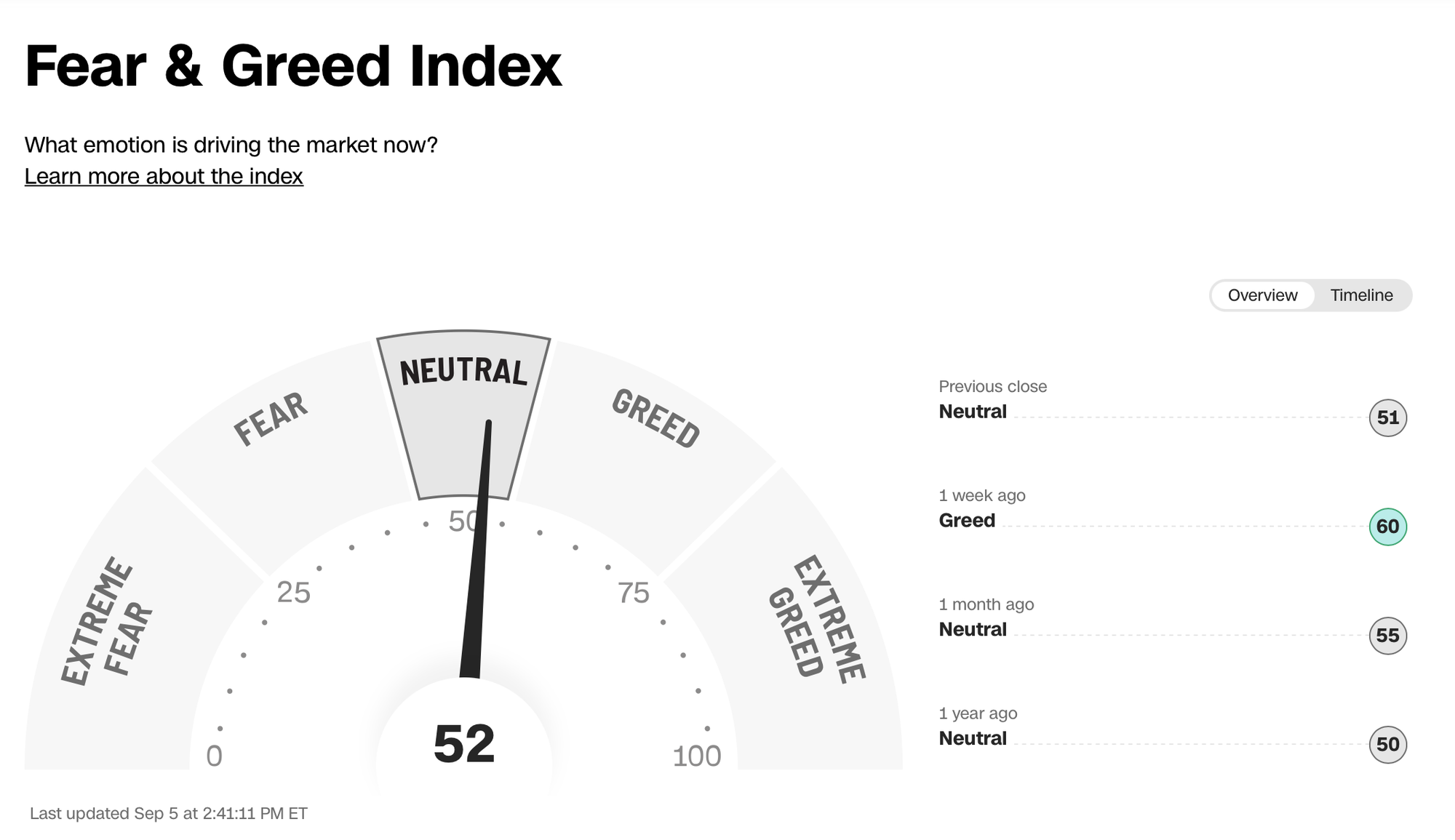 The Fear & Greed Index indicates that we’re currently in ‘Neutral’ Mode.