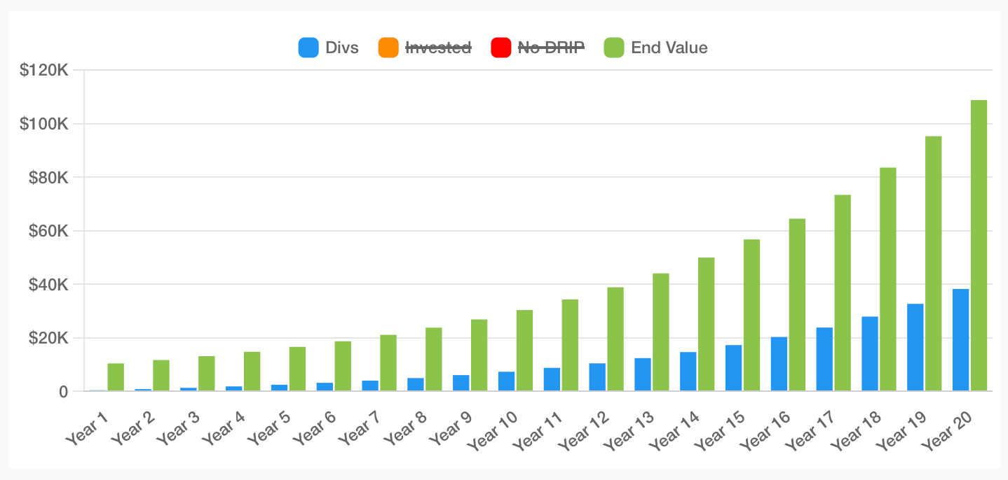 Using the historical numbers for SCHD, after 20 years, a $10,000 investment would be worth over $100,000.