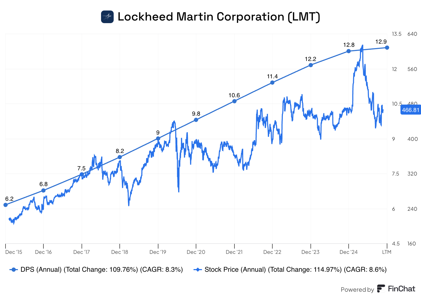 Notice the steadily rising Dividend Per Share line and compare it to the jagged price line.