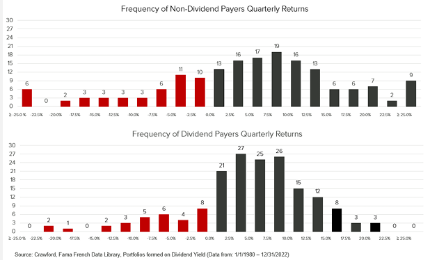 The image shows how often dividend-paying stocks and non-dividend stocks have negative returns.