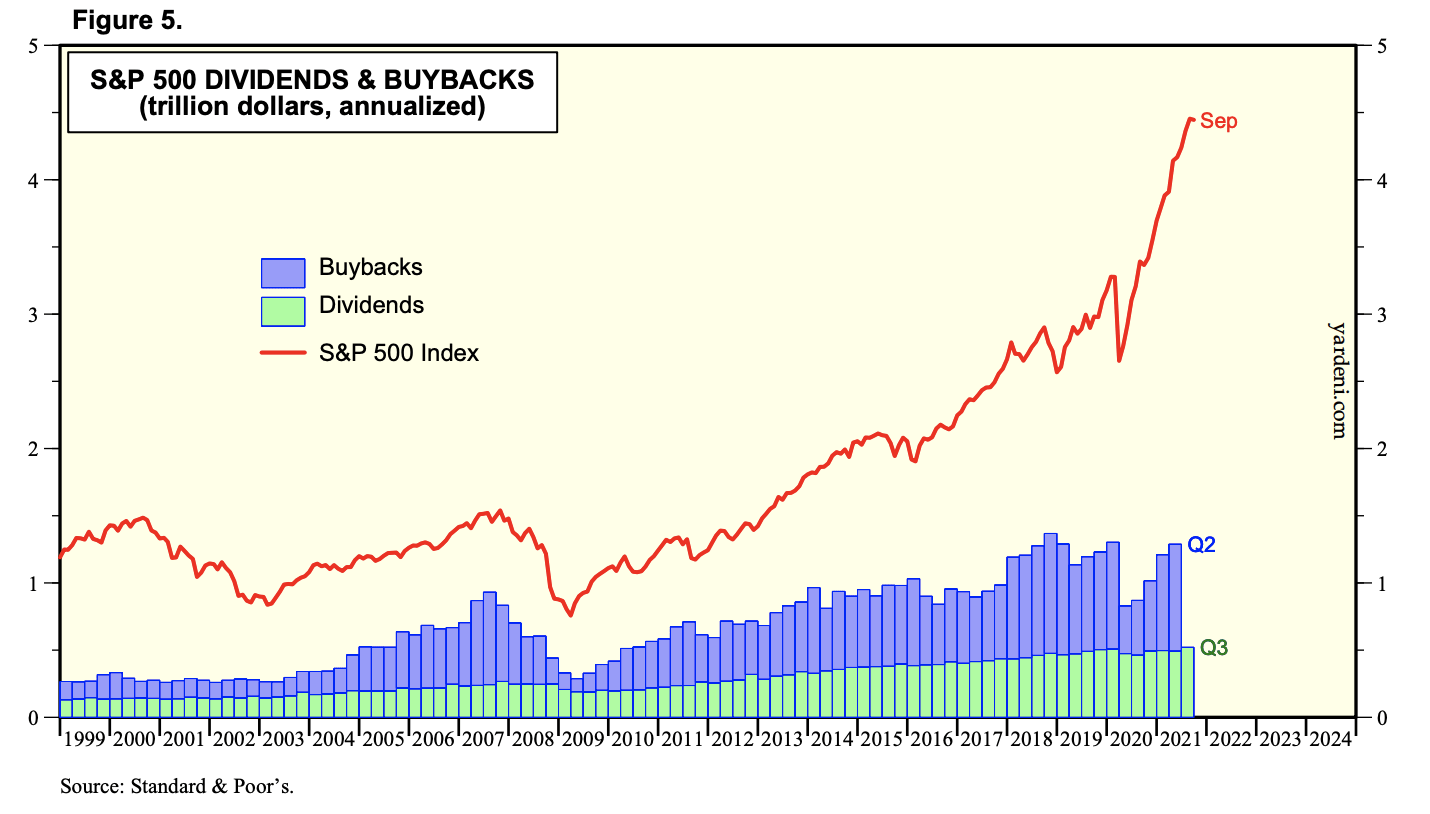 Pay attention to the growth of buybacks versus dividends, especially since 2008.