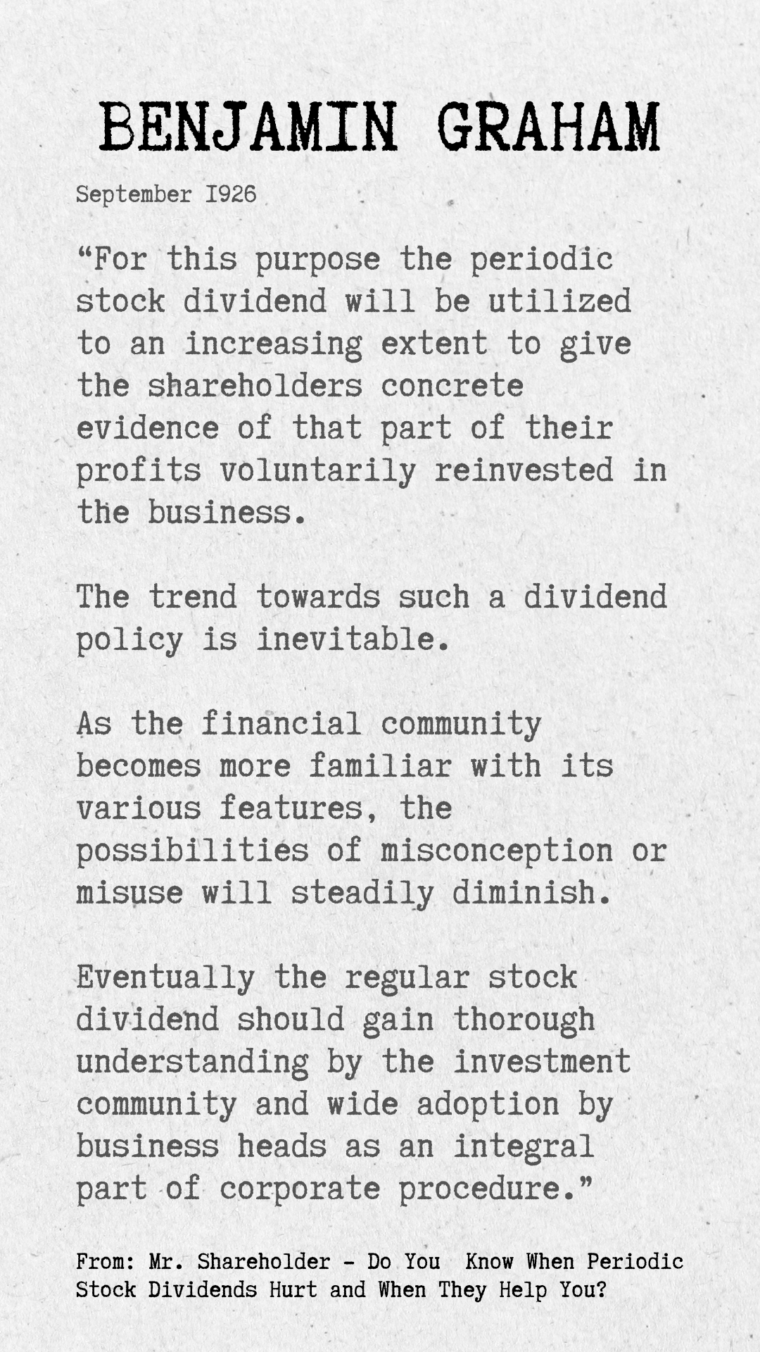 “Periodic stock dividends are the practical equivalent of cash - readily saleable by those who want money rather than stock.” - Benjamin Graham