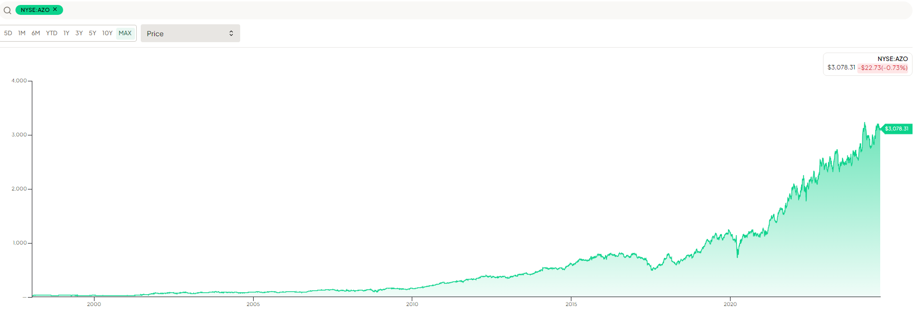 Between 1998 and 2024, AutoZone has bought back more than 88% of their shares outstanding.