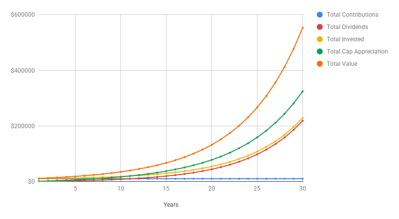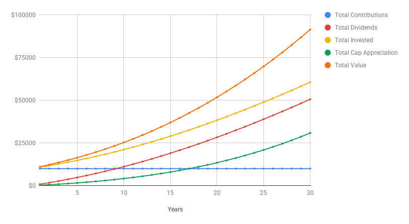 - 30 Years: Now you’re looking at more than $125,000, and $537 a year in dividends.