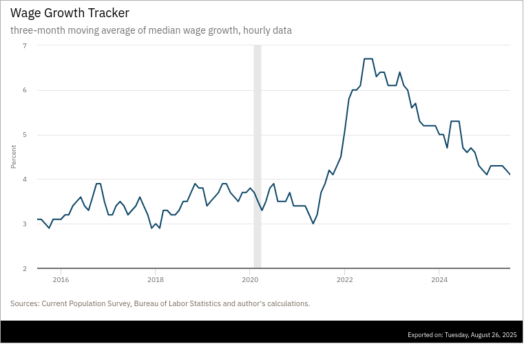 The Atlanta Fed’s wage tracker shows the same pattern: a big spike in 2022, then slowing, but still above the pre-COVID baseline.