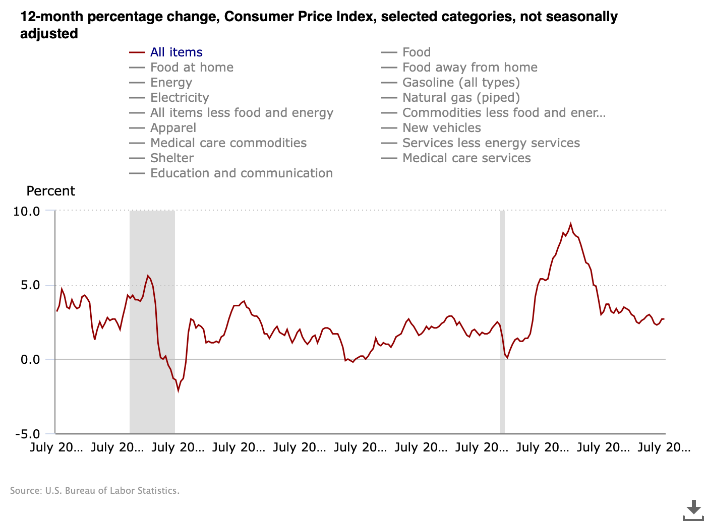 Here’s the yearly change in the U.S. Consumer Price Index over the past 20 years.