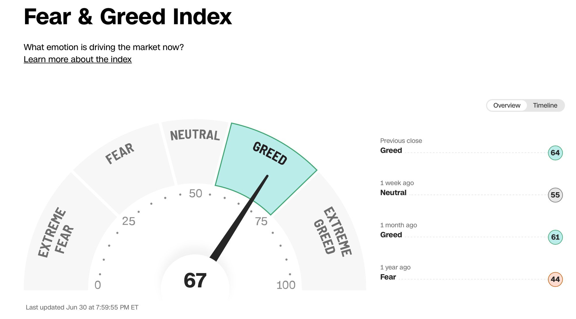 The Fear & Greed Index indicates that we ended June in ‘Greed’ Mode.