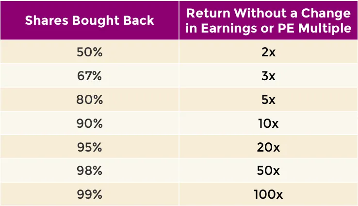 If you own a business that earns $10 per share and the company buys back 50% of its outstanding shares, EPS will increase from $10 to $20. As a result, the stock price should also double.