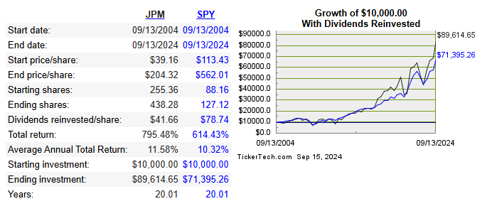If you invested $10,000 in J.P. Morgan 20 years ago and reinvested your dividends, you would have the following: