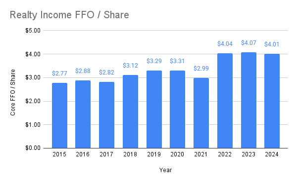 FFO per share has been growing relatively steadily at around 4% per year on average: