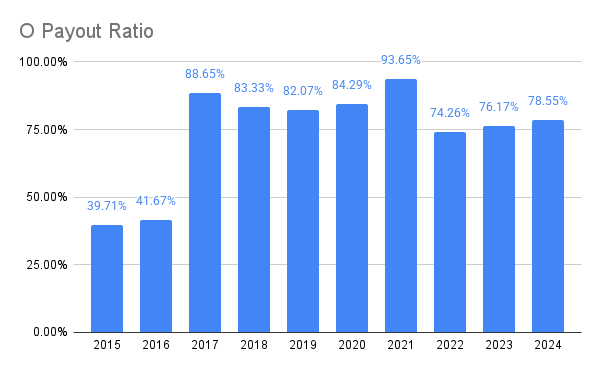 Realty Income’s management tends to focus on AFFO/Share, however. That number tends to be higher than FFO, and if we use management’s preferred metric, the payout ratio does come down.