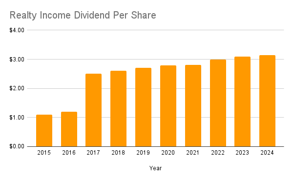 Realty Income has increased its dividend for 31 straight years, with a 2.9% 5-year CAGR.