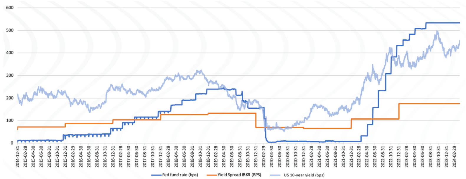 The graph below shows a connection between the average earnings IBKR gets from customer cash and the interest rate set by the central bank.
