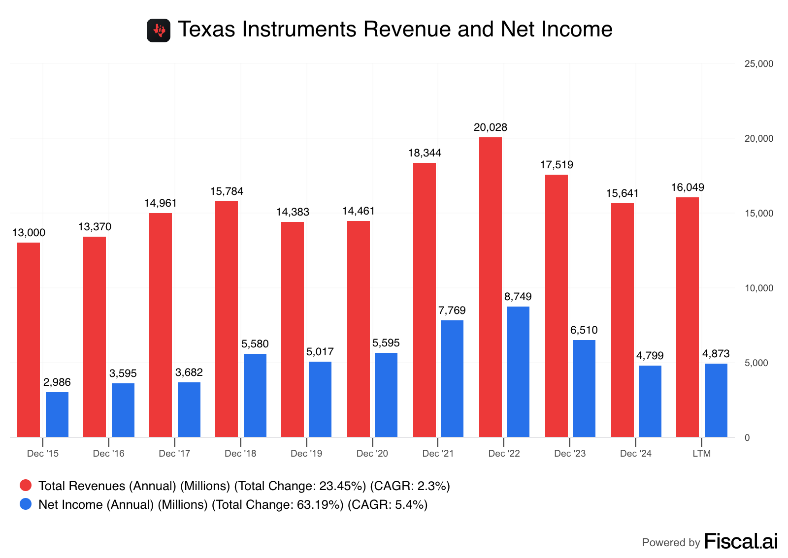 The semiconductor industry tends to be cyclical, with periods of strong demand followed by downturns. From 2022 to 2023, TI saw revenues drop 12%. Between 2023 and 2024, they fell another 10%.