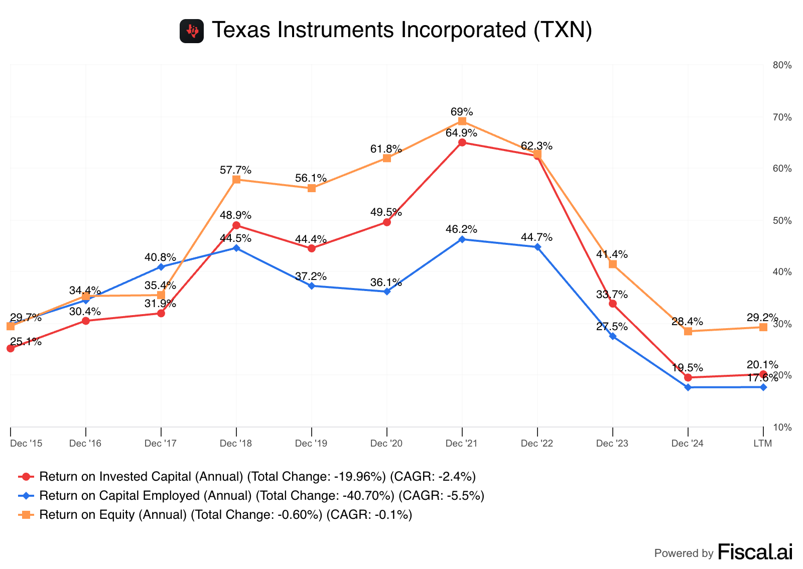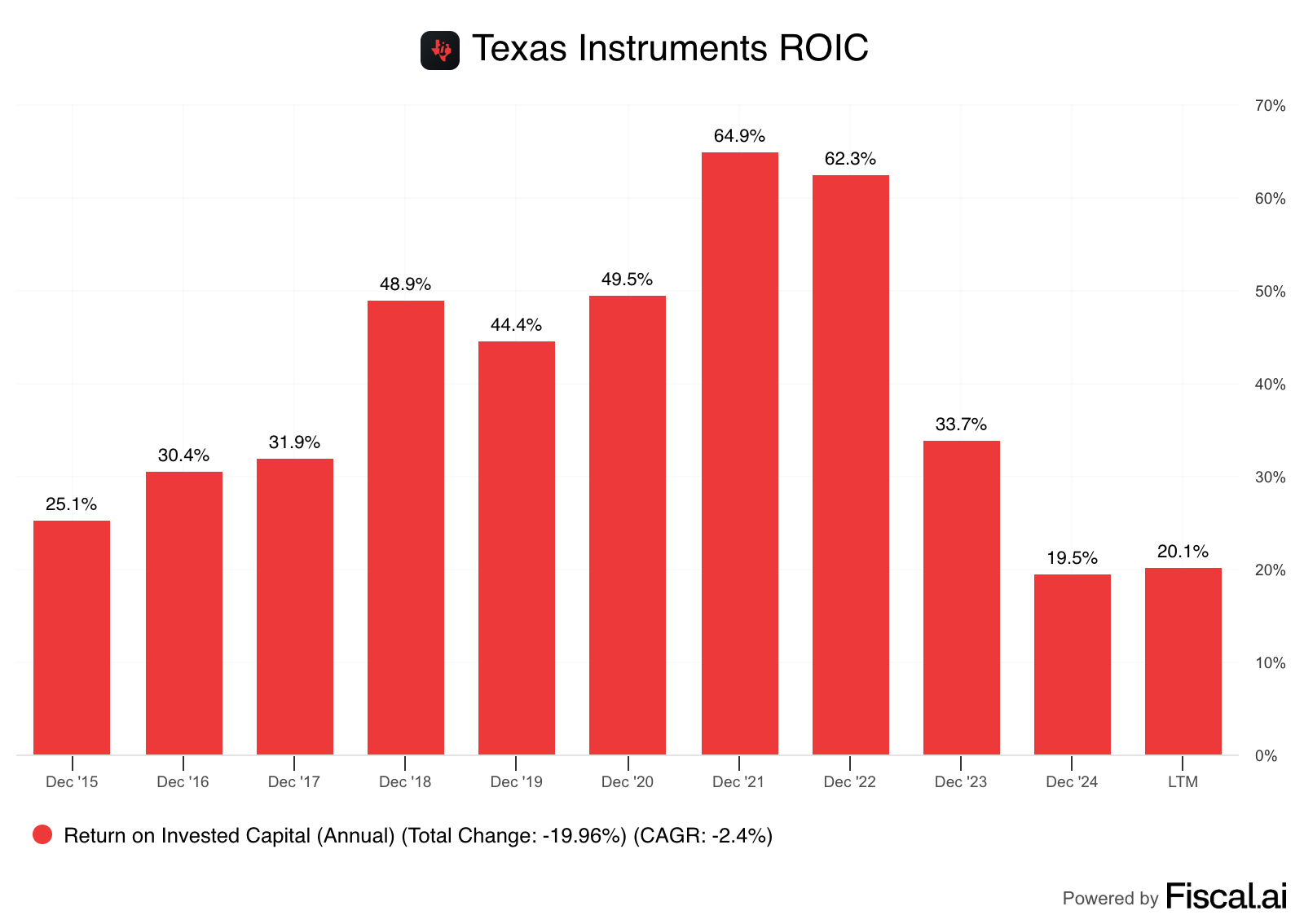The management team at Texas Instruments has generated attractive Returns on Invested Capital for a long time:
