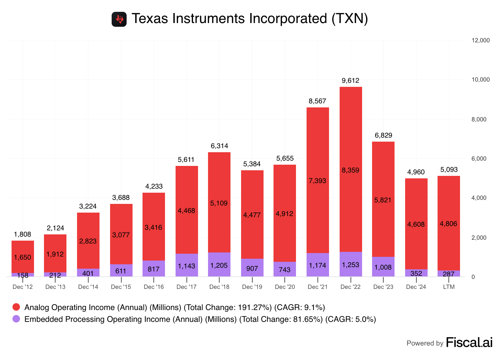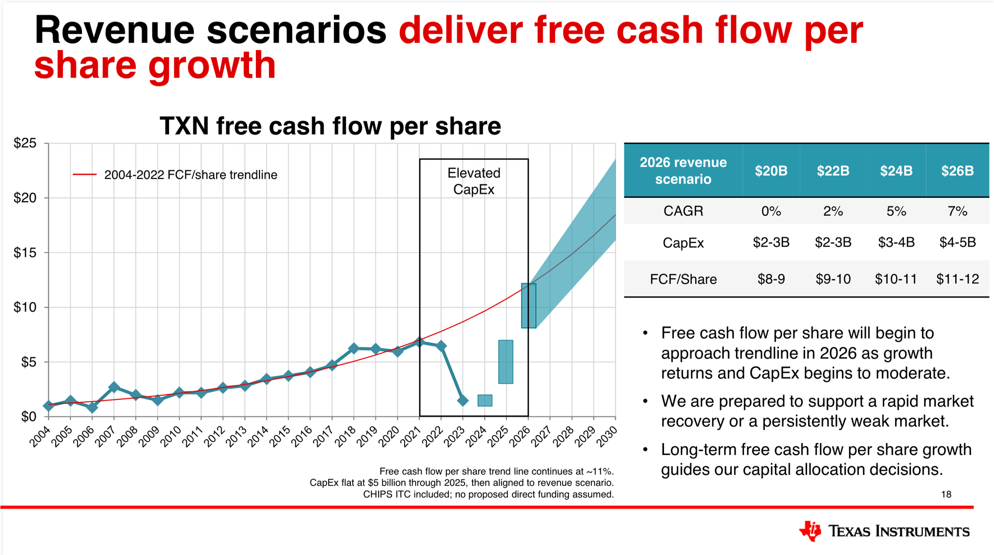 Remember the CapEx cycle I talked about where Texas Instruments is spending a lot on growth? That’s happening at the same time the industry has slowed down post-COVID, making the earnings look much lower than they actually are.