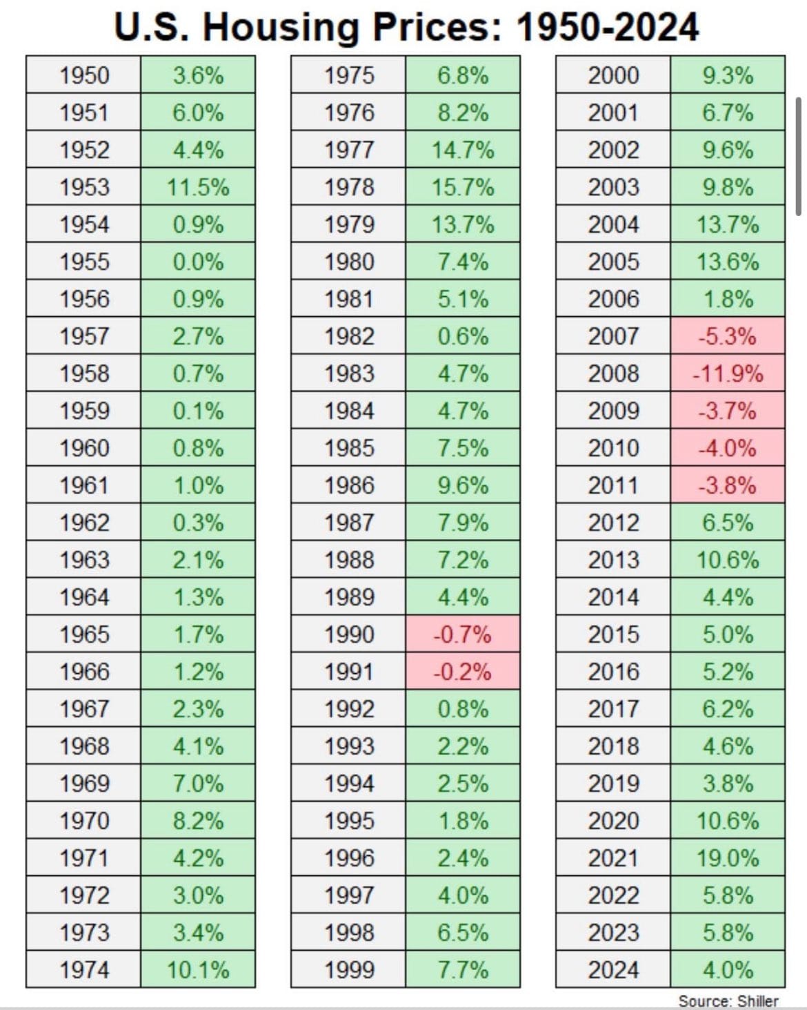 Hereās U.S. how much U.S. housing prices went up each year from 1950 to 2024.