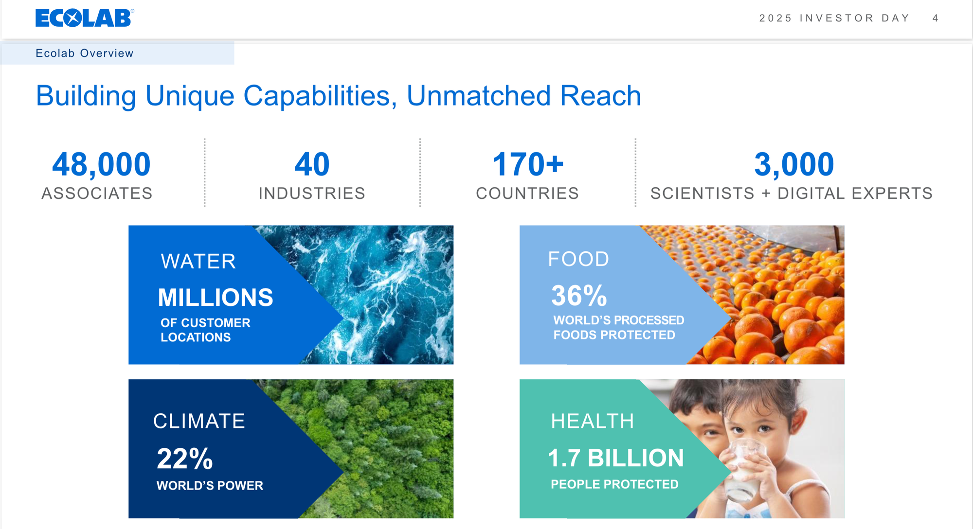 Ecolab (ECL) provides cleaning, sanitation, and water treatment solutions for industries like hotels, hospitals, and restaurants.