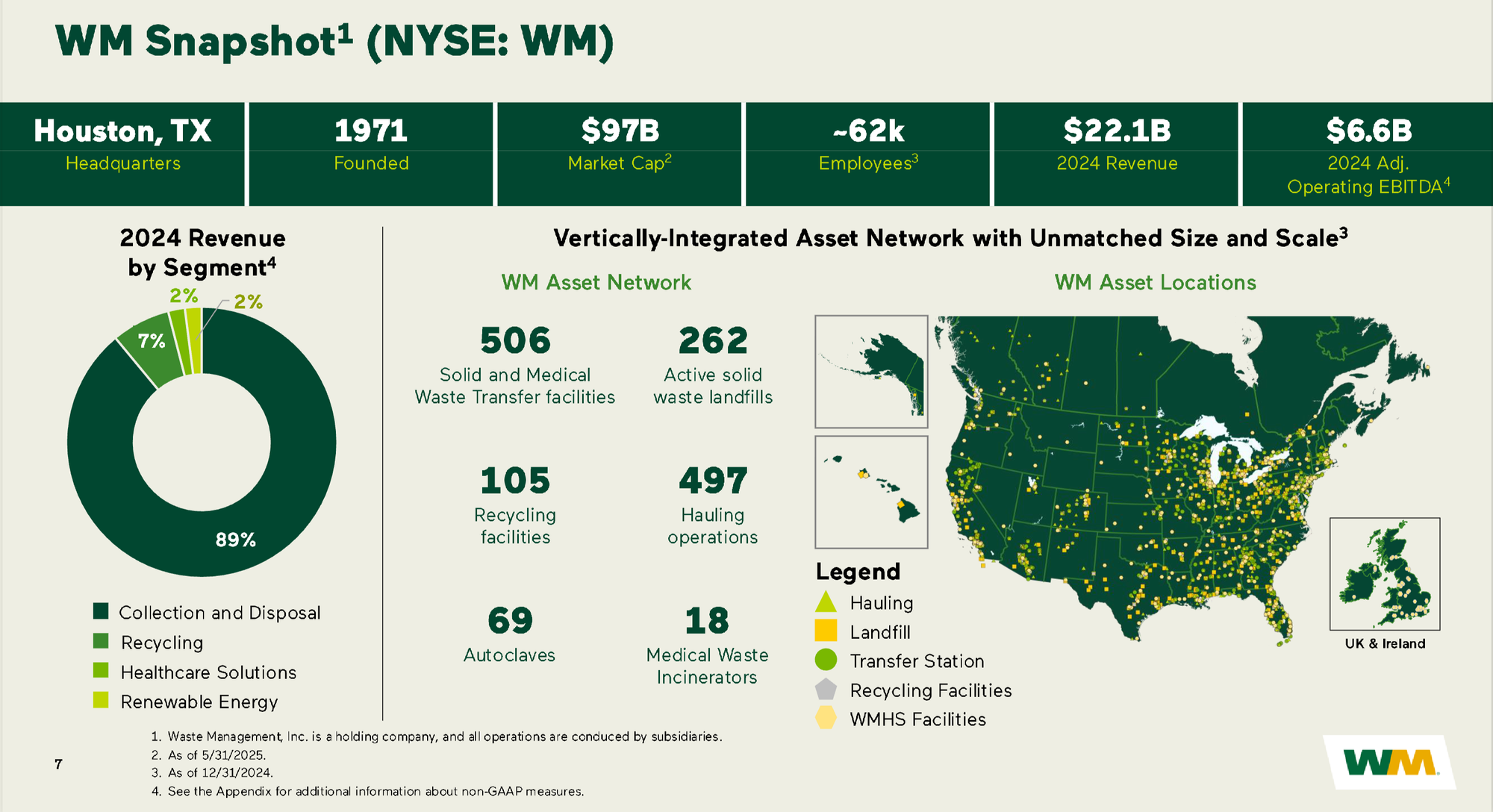Waste Management (WM) collects, recycles, and disposes of trash across North America. They also run landfills and recycling centers.