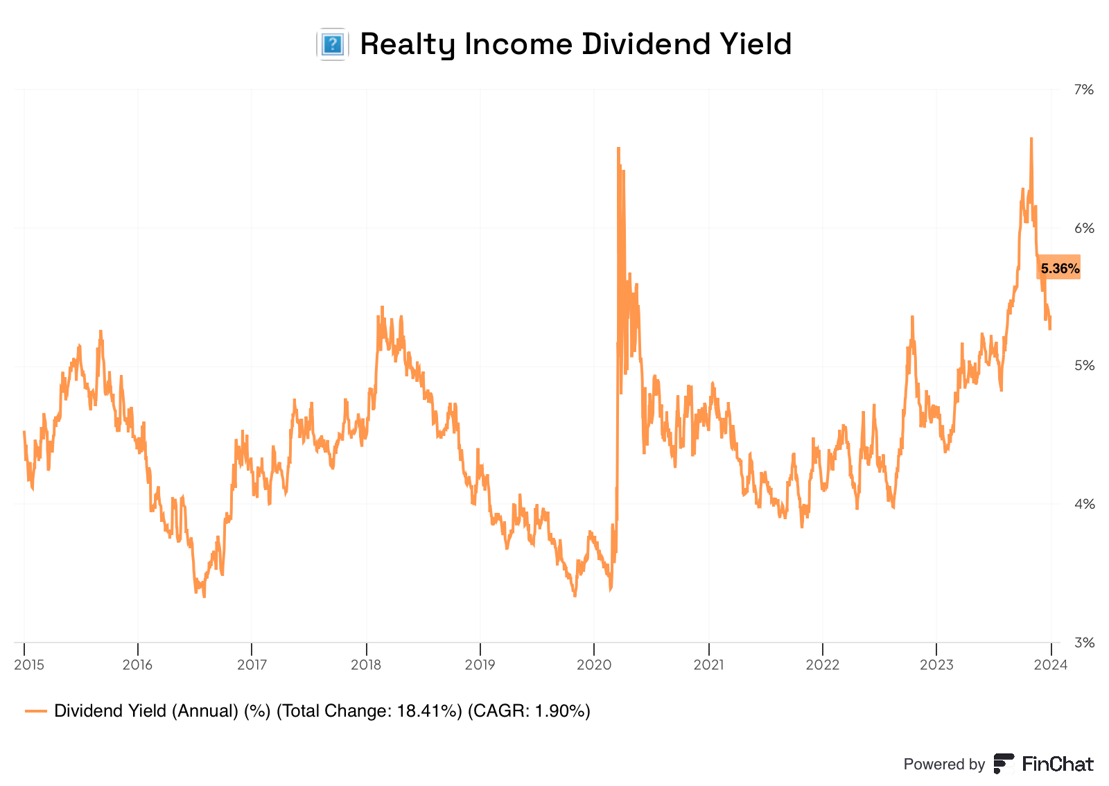 Realty Income’s dividend yield is somewhat high compared to the past 10 years.